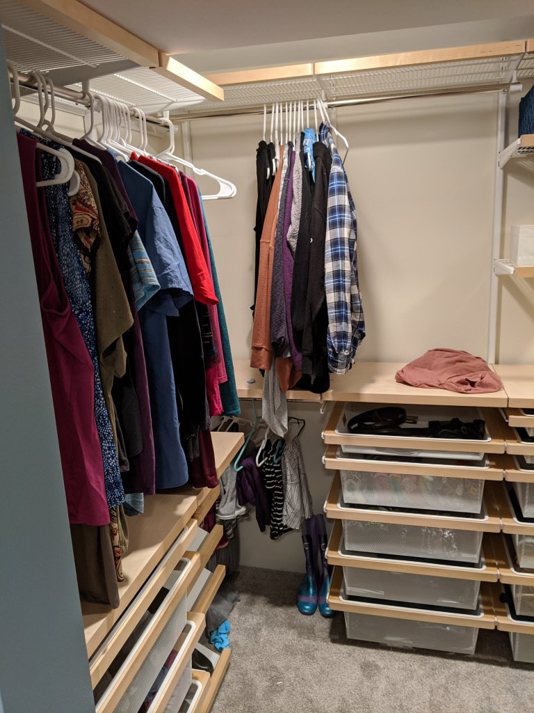 Many hours of installation work later and we have a closet that works way better than I thought it would! And is impossible to capture in pictures without a much ridiculously wide angle lens. Here’s a peek: