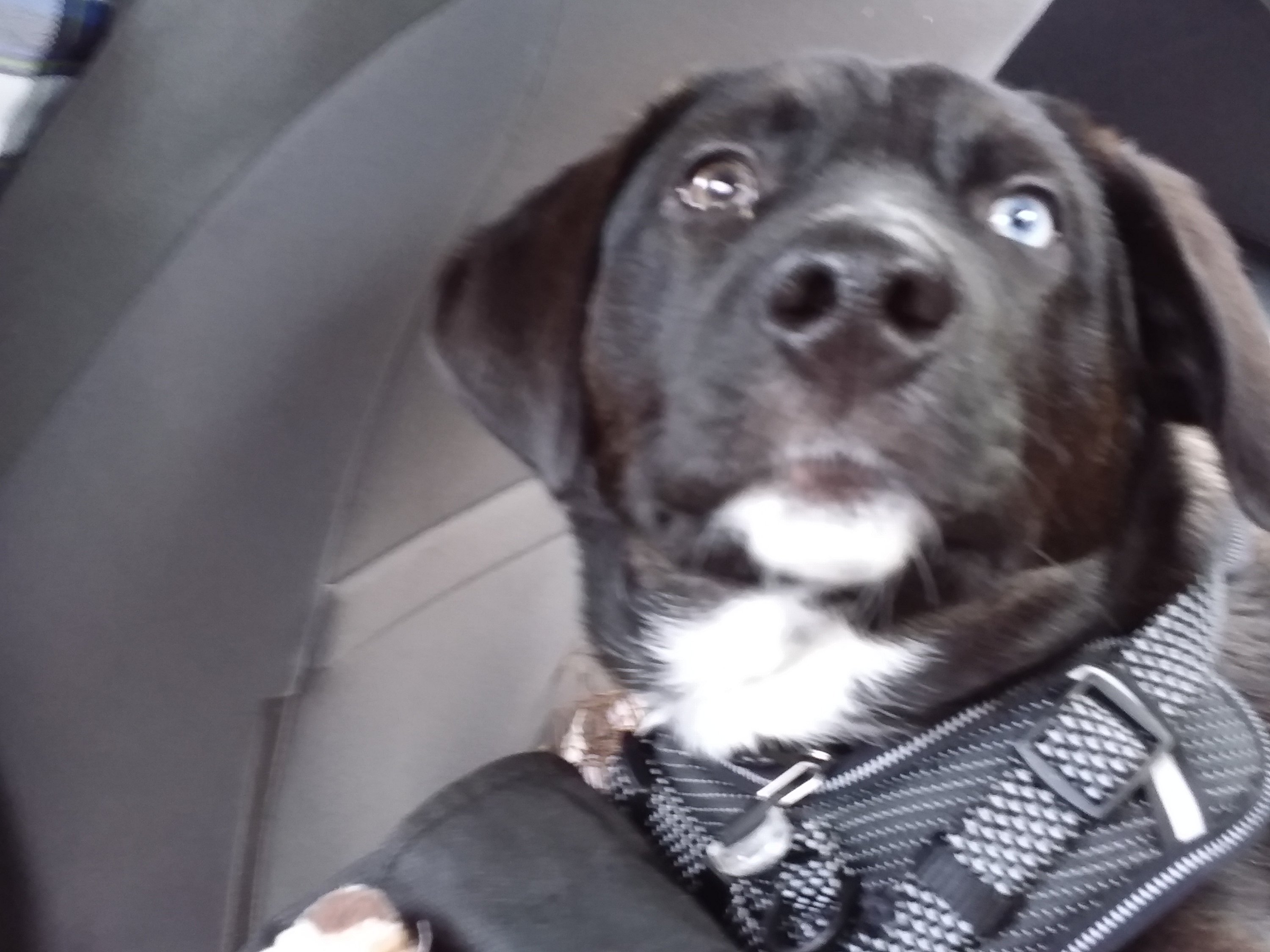 Pepper, Mama, Papa, and I went home from Montana today, and I called the pup, he looked right at me and I took this pic:-ZoëP.S. Look how long his shnozzle is!