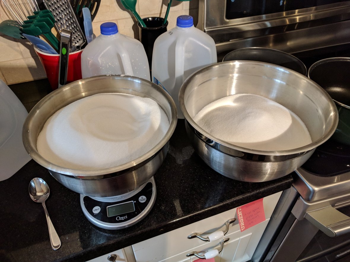 It’s been a rough season for our bees, so I needed to mix up some sugar syrup to feed them this fall. Fall feed is typically 2:1 sugar to water by weight.