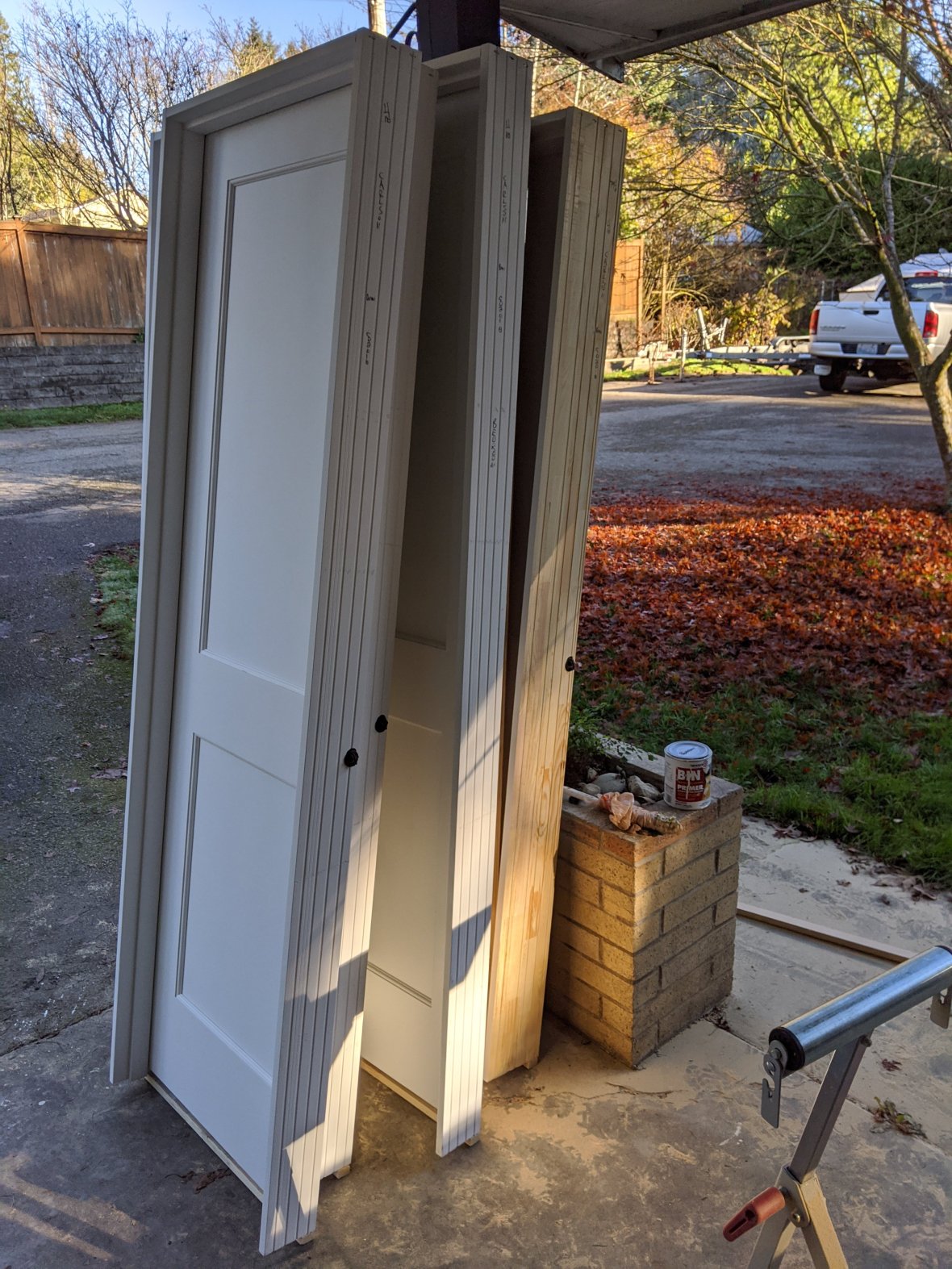 I’ve been taking advantage of the nice weather to do some trim priming outside, so I’ve just gotten to hanging those doors. 3 down, 2 to go.